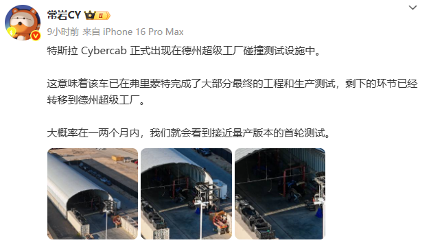 【CNMO科技消息】近日,有消息称,特斯拉Cybercab瑶鸿配资出现在德州超级工厂碰撞测试设施中瑶鸿配资,这意味着该车已在弗里蒙特完成了大部分最终的工程和生产测试,剩下的环节已经转移到德州超级工厂。在一到两个月内,或将迎来接近量产版本的首轮测试。